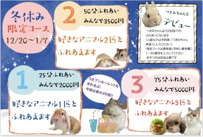 新入社員月見ちゃん、すくすくと育っております☺️12/20日よりついに通常(25分)ふれあいデビューになります🐰指名が集中するといけないので、月見ちゃんの出勤は1日3回までになります!時間帯によっては指名できないこともありますので、心配な方は予約時備考欄に月見ちゃん希望とご記入ください🙇‍♀️